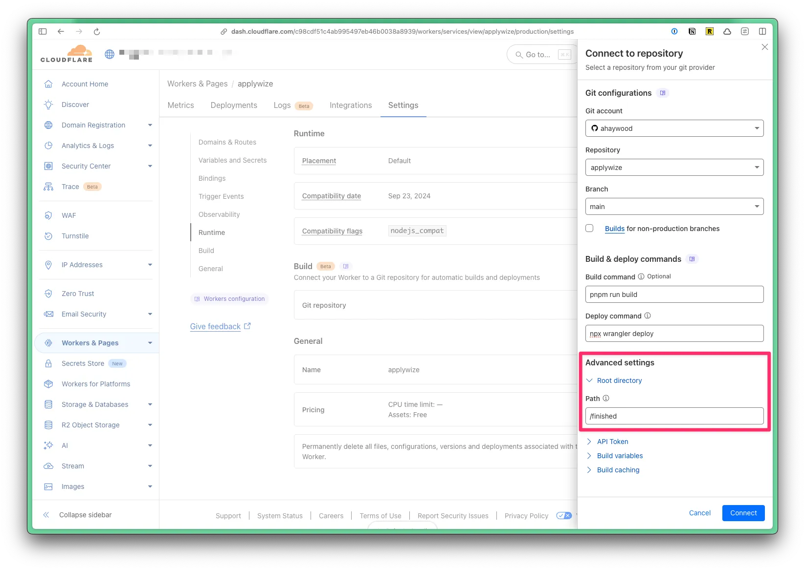 You can connect your application to GitHub, so that anytime you push a commit to a given branch, it will automatically deploy your application. Go to Workers & Pages in the left side navigation. Then, click on the name of your project. Click on the Settings tab. Near the bottom of the page, you’ll find a section called Build where you can connect GitHub.