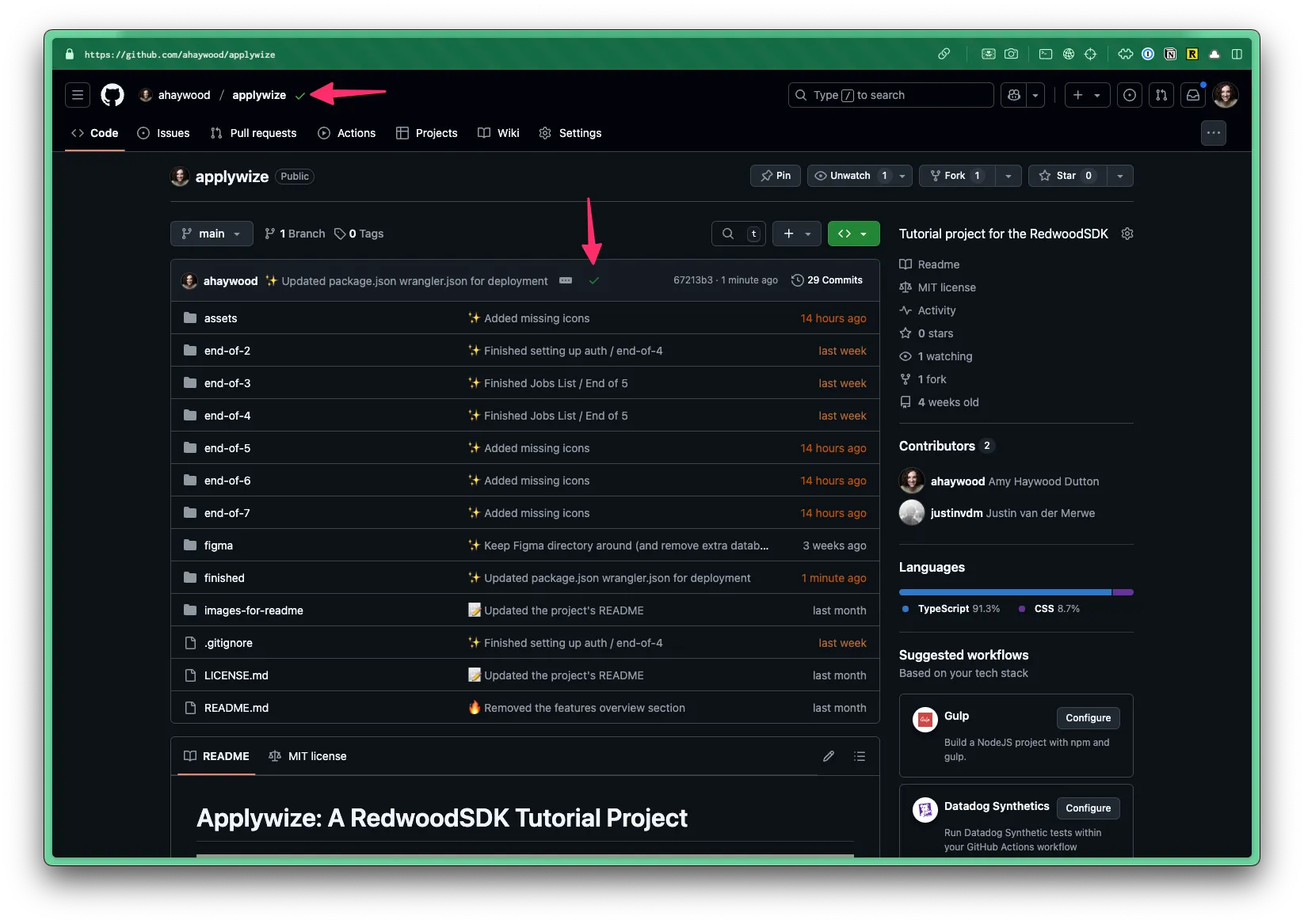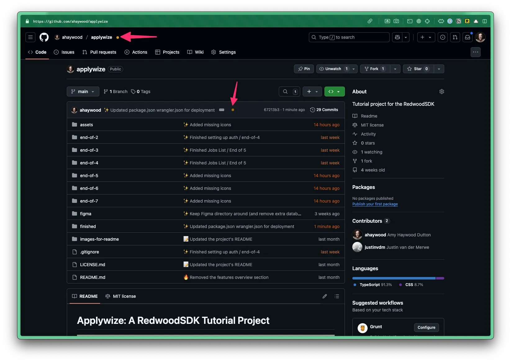 Try pushing a commit to the main branch and your application should deploy automatically. While it’s building, you’ll see a yellow dot next to the repository name in GitHub: