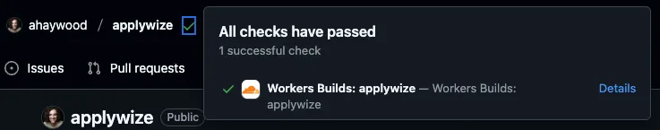 Once the checks have passed and the build is successful, the yellow dot will change to a green checkmark.